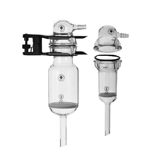 用于過濾干燥對(duì)空氣敏感的樣品, 是將惰性氣體通過上面的氣體入口通入過濾杯對(duì)樣品進(jìn)行過濾。通過O 型圈將過濾杯和過濾杯蓋密封連接起來, 這樣可以形成濾杯開口, 方便過濾操作。漏斗可以承受20psi 大氣壓, 但是使用者要注意操作Safety, 比如使用遮擋板。使用7669 固定架將濾杯、O型圈和濾杯蓋連接固定??梢蕴峁〢 型( 孔徑145-174 微米),B型(70-100 微米) 或者C 型(25-50 微米) 的濾片, 其他孔徑的濾板可以訂制。下表中的套裝包括:濾杯, 濾杯蓋,O 型圈, 但是7669 固定架需要單獨(dú)定貨.