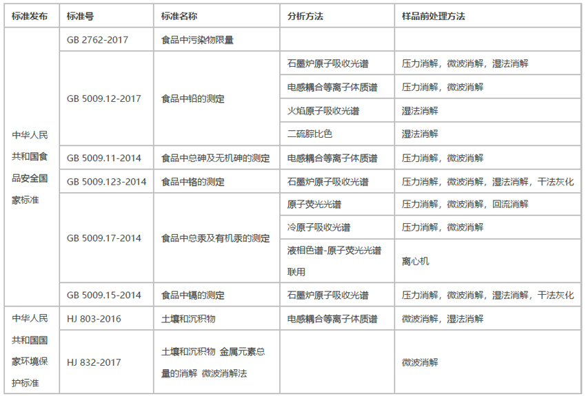 我國對食品和土壤中的重金屬檢測已有多個標準: